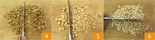 Hacken Sie die Trockenfrüchte grob mit einem Messer: Walnüsse 4, Haselnüsse 5 und Mandeln 6.