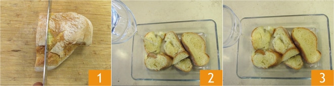 Um die toskanische Panzanella zuzubereiten, schneiden Sie zunächst das altbackene Brot in Scheiben 1 und legen Sie es in eine Auflaufform. Dann gießen Sie das Wasser 2 und den Essig 3 darüber. Lassen Sie es 15 Minuten ruhen und wenden Sie es häufig, damit es gleichmäßig einweicht.