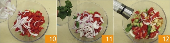 Fügen Sie auch die Zwiebel 10 und die Basilikumblätter 11 hinzu. Mischen Sie, salzen 12 und pfeffern Sie.