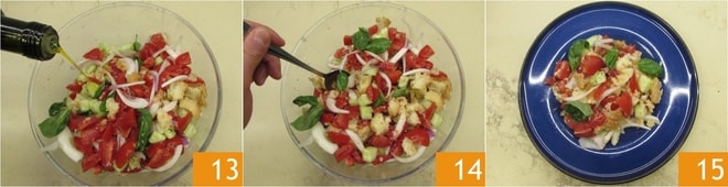Zum Schluss mit dem Öl 13 würzen und nochmals mischen 14. Ihre toskanische Panzanella ist bereit zum Genießen 15!