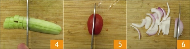 Bereiten Sie inzwischen den Rest der Zutaten vor: Schälen Sie die Gurken und schneiden Sie sie in Scheiben oder Würfel 4, waschen Sie dann die Kirschtomaten und halbieren Sie sie 5. Schließlich schälen Sie die Zwiebel und schneiden Sie sie in dünne Scheiben 6.