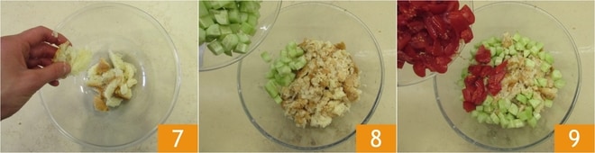 Nach der Einweichzeit drücken Sie das Brot gut aus, um überschüssiges Wasser zu entfernen 7, und geben es in eine Schüssel. Dann fügen Sie die Gurken 8 und die Kirschtomaten 9 hinzu.