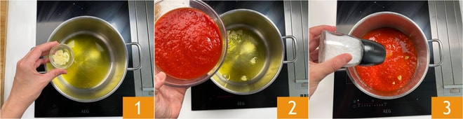 Um die Pappa al Pomodoro zuzubereiten, erhitzen Sie in einem Topf leicht das Öl, schälen Sie den Knoblauch und schneiden Sie ihn in dünne Scheiben (wenn Sie ihn nicht mögen, können Sie ihn im Ganzen verwenden und später entfernen). Braten Sie leicht an 1, dann fügen Sie das Tomatenpüree hinzu 2 und etwas Salz 3. Lassen Sie es sanft für etwa eine halbe Stunde köcheln.