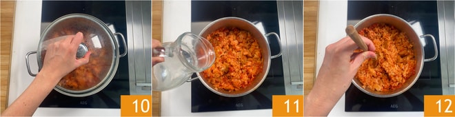 Decken Sie mit dem Deckel ab 10 und lassen Sie es etwa 15 Minuten ruhen. Nach dieser Zeit wird das Brot gut eingeweicht und mit Soße durchtränkt sein, fügen Sie bei Bedarf noch Wasser hinzu 11 und rühren Sie gut um 12. Stellen Sie es wieder auf den Herd und lassen Sie es sanft für weitere 5 Minuten köcheln oder bis zur gewünschten Konsistenz: Die Brotscheiben sollten vollständig zerfallen und eine regelrechte "Pappa" bilden.