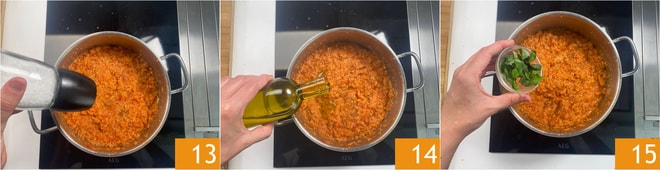 Schalten Sie den Herd aus und passen Sie das Salz an 13, dann vervollständigen Sie mit einem großzügigen Schuss Öl 14 und ein paar Basilikumblättern 15.