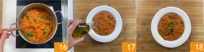 Rühren Sie gut um und servieren Sie es heiß, lauwarm oder kalt, indem Sie das Gericht mit einem weiteren Ölstrich 17 und Basilikumblättern 18 garnieren!