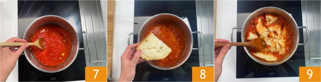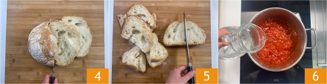 In der Zwischenzeit schneiden Sie das Brot in Scheiben 4 und halbieren Sie diese 5. Wenn die Soße fertig ist, verdünnen Sie sie mit etwas Wasser 6 (die Menge des Wassers kann je nach Brotsorte variieren).