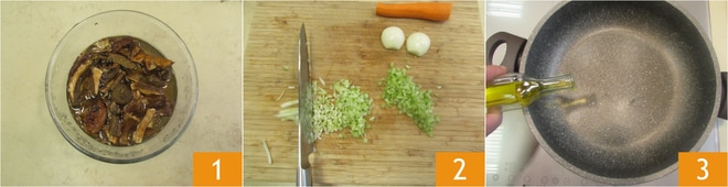 Um die Pappardelle mit Linsen- und Pilzragout zuzubereiten, spülen Sie zuerst die getrockneten Pilze ab und weichen Sie sie dann in kaltem Wasser ein 1 für mindestens 10-15 Minuten, gerade genug Zeit, um den Rest vorzubereiten. Jetzt kümmern Sie sich um das Linsenragout: Putzen Sie Karotte, Sellerie und Zwiebel und hacken Sie sie fein 2. Geben Sie das extra native Olivenöl in einen Topf 3.