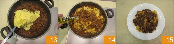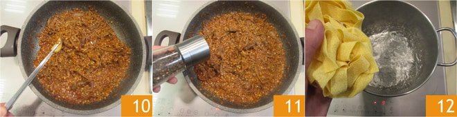Erst wenn das Ragout gekocht ist, entfernen Sie den Knoblauch 10 und würzen mit Salz und Pfeffer 11. Kochen Sie die Pappardelle 12 in gesalzenem kochendem Wasser.