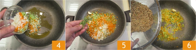 Fügen Sie die gehackten Zutaten für das Soffritto hinzu 4, die Thymianzweige und den Knoblauch 5 und lassen Sie alles bei mäßiger Hitze etwa 10 Minuten goldbraun werden. In der Zwischenzeit spülen Sie die Linsen ab und fügen Sie sie dem Soffritto hinzu 6.