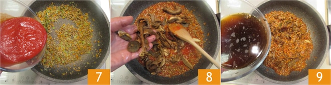 Mischen Sie alles gut und geben Sie das Tomatenpüree dazu 7. Fügen Sie die bereits eingeweichten und abgetropften Pilze hinzu 8, gießen Sie auch 100 g Einweichwasser hinzu, nachdem Sie es durch ein Tuch gefiltert haben, um Unreinheiten zu entfernen 9, und mischen Sie erneut. Lassen Sie es etwa 40 Minuten kochen. Die Kochzeiten können je nach Art der Linsen, die Sie kaufen, variieren, deshalb empfehlen wir, die Anweisungen auf der Verpackung zu lesen und sich daran zu halten.