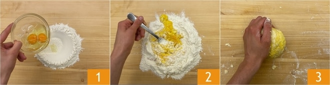 Um die Pappardelle mit Steinpilzen zuzubereiten, beginnen Sie zuerst mit der frischen Pasta: geben Sie das Mehl auf die Arbeitsfläche, in die Mitte geben Sie die Eier 1 und eine Prise Salz. Beginnen Sie mit einer Gabel zu vermischen 2, dann kneten Sie mit den Händen weiter: Der Teig muss durch Ziehen und Falten etwa 10-15 Minuten energisch geknetet werden, bis er elastisch und homogen ist 3. Sollte er nicht perfekt glatt sein, machen Sie sich keine Sorgen: Nach der Ruhezeit wird er es sein.