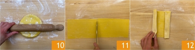 Holen Sie den frischen Teig zurück, nehmen Sie einen Teil und halten Sie den Rest unter der Frischhaltefolie, damit er nicht austrocknet. Rollen Sie ihn mit einem Nudelholz oder einer Nudelmaschine auf eine Dicke von 0,5 mm aus 10. Teilen Sie den erhaltenen Teig in kleinere Streifen 11, leicht bemehlen und die Kanten zur Mitte hin aufrollen, bis sie sich treffen 12.