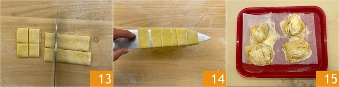 Drehen Sie den Teig so, dass er der Länge nach vor Ihnen liegt und schneiden Sie ihn mit einem scharfen Messer auf 2-3 cm Breite 13. Heben Sie dann die entstandenen Rollen an 14 und legen Sie die Pappardellenester nach und nach auf ein mit Backpapier ausgelegtes Tablett, das leicht mit Grießmehl bestäubt ist 15. Beiseite stellen.