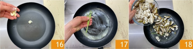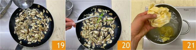 Bereiten Sie die Soße zu: Geben Sie ein Stück Butter in die Pfanne 16, den Knoblauch und die Petersilienstiele 17. Lassen Sie es bei mittlerer Hitze Aroma aufnehmen, geben Sie die Steinpilze hinzu 18, salzen, pfeffern und 5-6 Minuten bei hoher Hitze kochen.