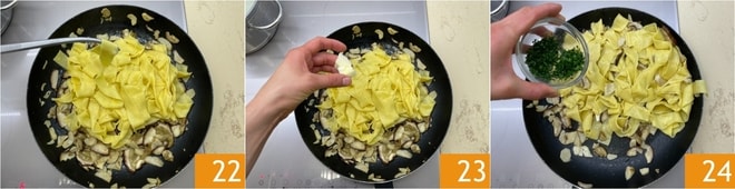 Die Pappardelle in die Pfanne geben 22, mit einem Stück Butter mischen 23 und mit Petersilie würzen 24.