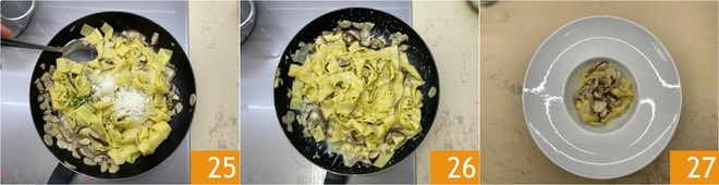 Fügen Sie nach Belieben Parmigiano Reggiano hinzu 25 und mischen Sie 26. Servieren Sie die Pappardelle mit Steinpilzen heiß 27.