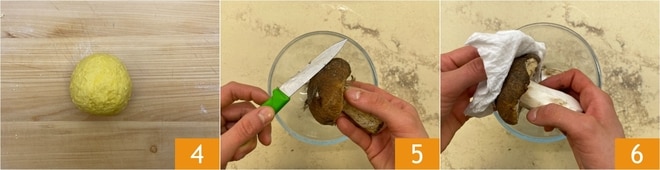 30 Minuten ruhen lassen 4, Sie können ihn in Frischhaltefolie wickeln und an einem kühlen und trockenen Ort aufbewahren (oder im Kühlschrank, nur wenn die Raumtemperatur sehr hoch ist). In der Zwischenzeit reinigen Sie die Steinpilze, entfernen Sie Erde und Unreinheiten zuerst vorsichtig mit einem kleinen Messer 5, dann mit einem trockenen Tuch oder, falls viel Erde vorhanden ist, mit einem leicht angefeuchteten Tuch 6.