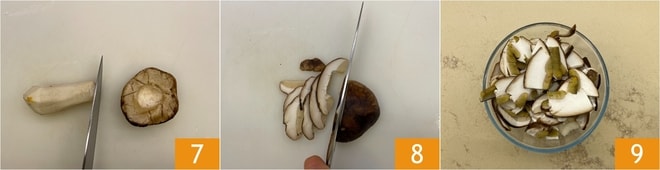 Trennen Sie die Stiele von den Hüten 7, dann alles in Scheiben schneiden 8 und beiseite stellen 9.