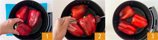 Um die Paprika mit der Heißluftfritteuse zuzubereiten, waschen Sie sie zuerst, trocknen Sie sie ab und legen Sie sie in den Korb der Heißluftfritteuse. Starten Sie den Garvorgang für 30 Minuten bei 200°, indem Sie sie nach der Hälfte der Garzeit wenden 2. Sie sollten auf allen Seiten gut gebräunt sein 3. Am Ende des Garvorgangs lassen Sie die Paprika etwa 30 Minuten in der ausgeschalteten Heißluftfritteuse abkühlen. Auf diese Weise bildet sich Dampf in der Kammer, und die Paprika lassen sich leicht schälen.