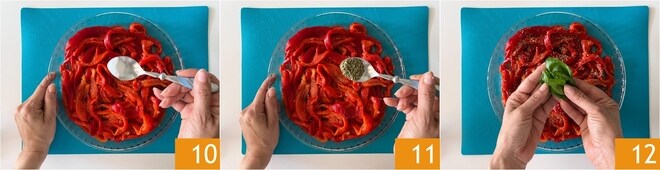 Würzen Sie die Paprika mit Salz 10, Oregano 11 und mit den Händen zerrissenen Basilikumblättern 12.