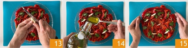 Fügen Sie auch die geschälte und in Streifen geschnittene Knoblauchzehe 13, das Öl 14 hinzu und mischen Sie. Sie können die Paprika sofort servieren 15 oder sie im Kühlschrank abkühlen lassen.