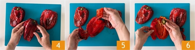 Nach dem Abkühlen nehmen Sie die Paprika aus dem Korb 4 und entfernen die äußere Haut, indem Sie sie vorsichtig mit den Händen abziehen 5. Entfernen Sie den Stiel 6.
