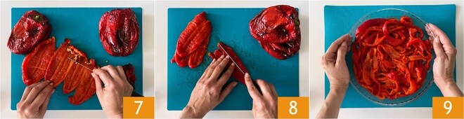 Entfernen Sie auch die Samen und die inneren Fasern, indem Sie sie mit der Messerrückseite abkratzen 7. Schneiden Sie sie in Streifen 8 und verteilen Sie sie auf einer Servierplatte 9.
