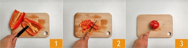 Um die Paprikacreme zuzubereiten, beginnen Sie mit den Paprikaschoten. Reinigen Sie sie, indem Sie den Stängel entfernen, dann halbieren Sie sie der Länge nach und entfernen auch die Samen und inneren Fasern 1. Schneiden Sie sie anschließend in Würfel 2. Reinigen Sie auch die Tomaten, halbieren Sie sie 3 und entfernen Sie den Stängelansatz.