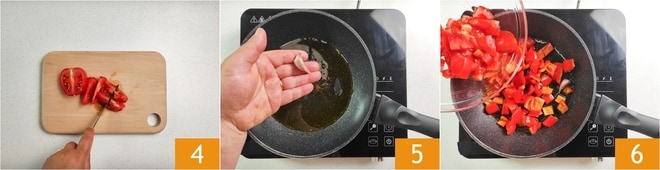 Schneiden Sie die Tomaten dann in Würfel 4. Geben Sie das Öl in die Pfanne, fügen Sie eine ungeschälte Knoblauchzehe hinzu 5 und lassen Sie sie anbraten. Geben Sie dann die Paprika und Tomaten hinzu 6 und würzen Sie mit Salz.
