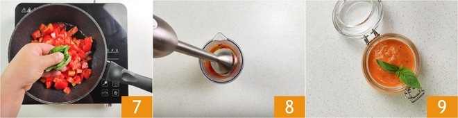 Aromatisieren Sie mit ein paar grob zerkleinerten Basilikumblättern 7 und kochen Sie bei mittlerer Hitze mit Deckel für 15 Minuten, gelegentlich umrühren. Wenn die Paprika gekocht sind, entfernen Sie die Knoblauchzehe und geben Sie sie in ein hohes Gefäß. Pürieren Sie mit einem Stabmixer 8 bis Sie eine dichte und samtige Creme erhalten. Übertragen Sie die Paprikacreme in ein Glas 9 und bewahren Sie sie im Kühlschrank bis zur Verwendung auf.
