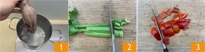 Beginnen Sie damit, den Oktopus in einem Topf mit kochendem Wasser 30 Minuten zu garen oder bis er beim Anfassen mit der Gabel zart ist. Waschen und schneiden Sie den Sellerie 2 und die roten Paprika 3 in Stücke.