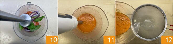 Mischen Sie alles gut mit einem Stabmixer für ein paar Minuten 10. Wenn die Mischung püriert ist 11, passieren Sie sie durch ein Sieb 12.