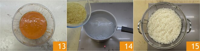 Stellen Sie das Gazpacho beiseite 13. Kochen Sie den Reis in kochendem und gesalzenem Wasser 14 für die auf der Packung angegebene Zeit, dann abseihen 15.