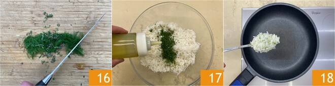 Hacken Sie den Fenchel und den Thymian 16 und geben Sie sie zum Reis, fügen Sie auch Öl 17 und Pfeffer hinzu. Braten Sie den Reis für ein paar Minuten bei starker Hitze in der Pfanne an 18.