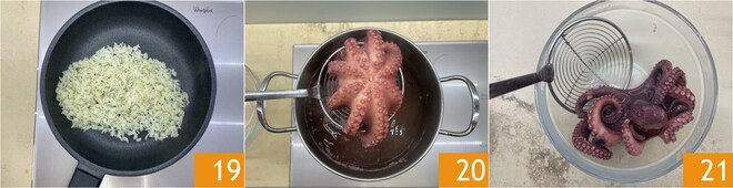 Stellen Sie den Reis beiseite 19. Der Oktopus ist inzwischen gekocht 20, seihen Sie ihn ab 21.