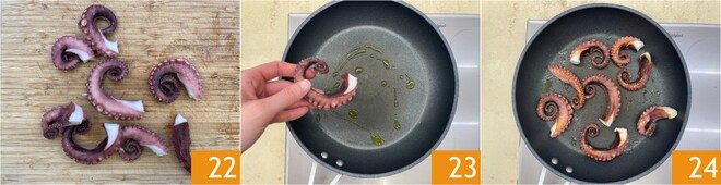 Schneiden Sie die Tentakel ab 22. In einer Pfanne erhitzen Sie einen Schuss Öl und legen die Tentakel hinein 23, rösten Sie sie gut von beiden Seiten 24.