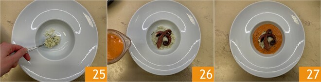 Richten Sie das Gericht an, indem Sie eine kleine Kuppel aus Basmati-Reis in die Mitte formen 25, dann zwei Tentakel oben drauflegen und schließlich das Gazpacho außen herum gießen 26. Ein Hauch von Pfeffer und ein Schuss Öl, das Paprikagazpacho mit Basmati und Oktopus ist servierfertig 27.