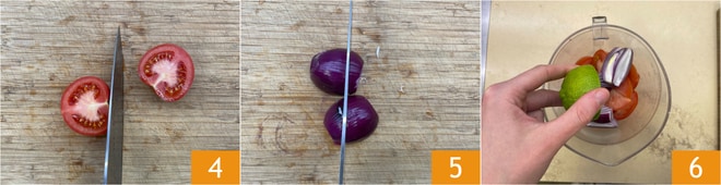 Machen Sie das Gleiche mit den Strauchtomaten 4 und dann auch mit der Zwiebel 5. In einem hohen und breiten Krug (oder einer Schüssel) geben Sie das grob geschnittene Gemüse und die ganzen Kirschtomaten. Fügen Sie den Limettensaft hinzu 6.