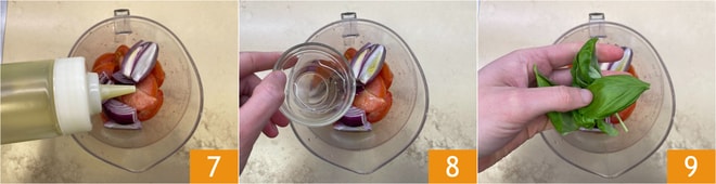 Gießen Sie das Öl 7 und den Essig 8 dazu, Salz, Pfeffer und Basilikum 9.