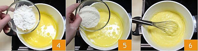 Fügen Sie dann die Maisstärke (alternativ können Sie Kartoffelstärke verwenden) und das zuvor gesiebte Mehl hinzu (4-5) und mischen Sie alles, bis Sie eine homogene Masse erhalten 6.