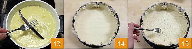 Sobald die Creme fertig ist, entfernen Sie die Vanilleschote 13. Nehmen Sie die Rolle Blätterteig, die gut kühl aus dem Kühlschrank sein muss, rollen Sie sie aus und legen Sie sie mit dem Backpapier in eine Springform mit einem Durchmesser von etwa 24 cm 14, dann stechen Sie den Boden mit einer Gabel 15 ein, damit der Teig beim Backen nicht zu stark aufgeht.
