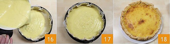 Gießen Sie die vorbereitete Creme 16 in die Springform, verteilen Sie sie gleichmäßig über die gesamte Oberfläche 17 und backen Sie den Flan im vorgeheizten statischen Ofen bei 170° etwa 1 Stunde (Umluftofen 150° für 50 Minuten). Sobald er gebacken ist, lassen Sie den Flan etwas abkühlen und dann im Kühlschrank etwa 1 Stunde ruhen, damit er sich zusammenzieht und sich gut festigt, sodass er sich auch einfach in Scheiben schneiden lässt. Ihr Flan Parisien wartet nur darauf, serviert zu werden 18!