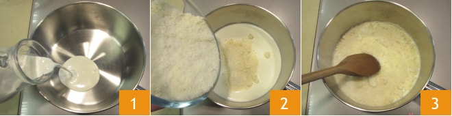 Um das Parmigiano Reggiano DOP-Fondue vorzubereiten, gießen Sie die frische Sahne in einen kleinen Topf 1 und beginnen Sie, sie bei mittlerer Hitze zu erwärmen. Dann fügen Sie einen Teil des geriebenen Parmigiano Reggiano DOP hinzu 2 und rühren Sie mit einem Holzlöffel um 3.