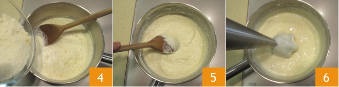 Fügen Sie nach und nach den Parmigiano Reggiano DOP hinzu 4, rühren Sie ständig um 5 und lassen Sie es einige Minuten eindicken. Wenn Sie eine glatte und cremige Konsistenz wünschen, können Sie das Fondue mit einem Stabmixer 6 pürieren.