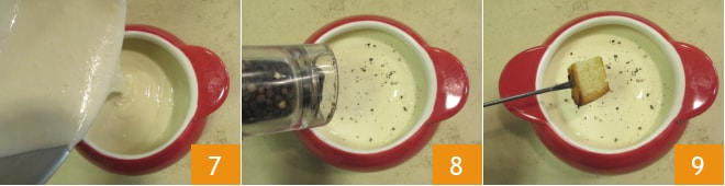 Gießen Sie das Fondue in den typischen Topf 7, fügen Sie eine Prise schwarzen Pfeffer hinzu 8 und servieren Sie Ihr Parmigiano-Fondue mit gerösteten Brotcrostini 9!