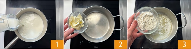 Um die Parmesancreme zuzubereiten, erhitzen Sie zunächst die Milch in einem Topf 1, sie sollte nicht zum Kochen kommen. In einem anderen Topf die Butter 2 bei niedriger Hitze schmelzen lassen. Das Mehl nach und nach hinzugeben 3.
