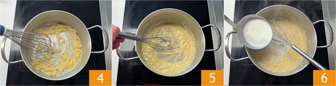 Mit einem Schneebesen verrühren 4, bis die Mehlschwitze gut vermischt und goldbraun ist 5. Die warme Milch nach und nach 6 unter ständigem Rühren mit dem Schneebesen hinzufügen, um die Bildung von Klumpen zu vermeiden. Auf niedriger Hitze köcheln lassen, bis die Masse eindickt.