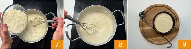 Den Herd ausschalten und den geriebenen Parmesan 7 nach und nach hinzufügen, dabei ständig mit dem Schneebesen rühren. Die Konsistenz sollte ziemlich dick sein 8, wenn Sie einen Löffel Creme entnehmen und ihn in den Topf fallen lassen, sollte er einen Moment auf der Oberfläche bleiben, bevor er eingearbeitet wird, dann ist die Konsistenz richtig. Ihre Parmesancreme ist bereit, für Ihre Zubereitungen verwendet zu werden 9.