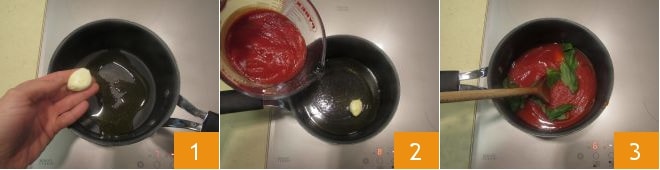Um die Parmigiana im Brötchen zuzubereiten, beginnen Sie mit der Sauce. In einem kleinen Topf erhitzen Sie einen Spritzer Öl zusammen mit einer geschälten Knoblauchzehe 1. Nach einigen Augenblicken geben Sie die Tomatenpassata hinzu 2 und dann die Basilikumblätter. Rühren Sie um, decken Sie mit dem Deckel ab und lassen Sie es bei schwacher Hitze etwa 25 Minuten lang köcheln 3.